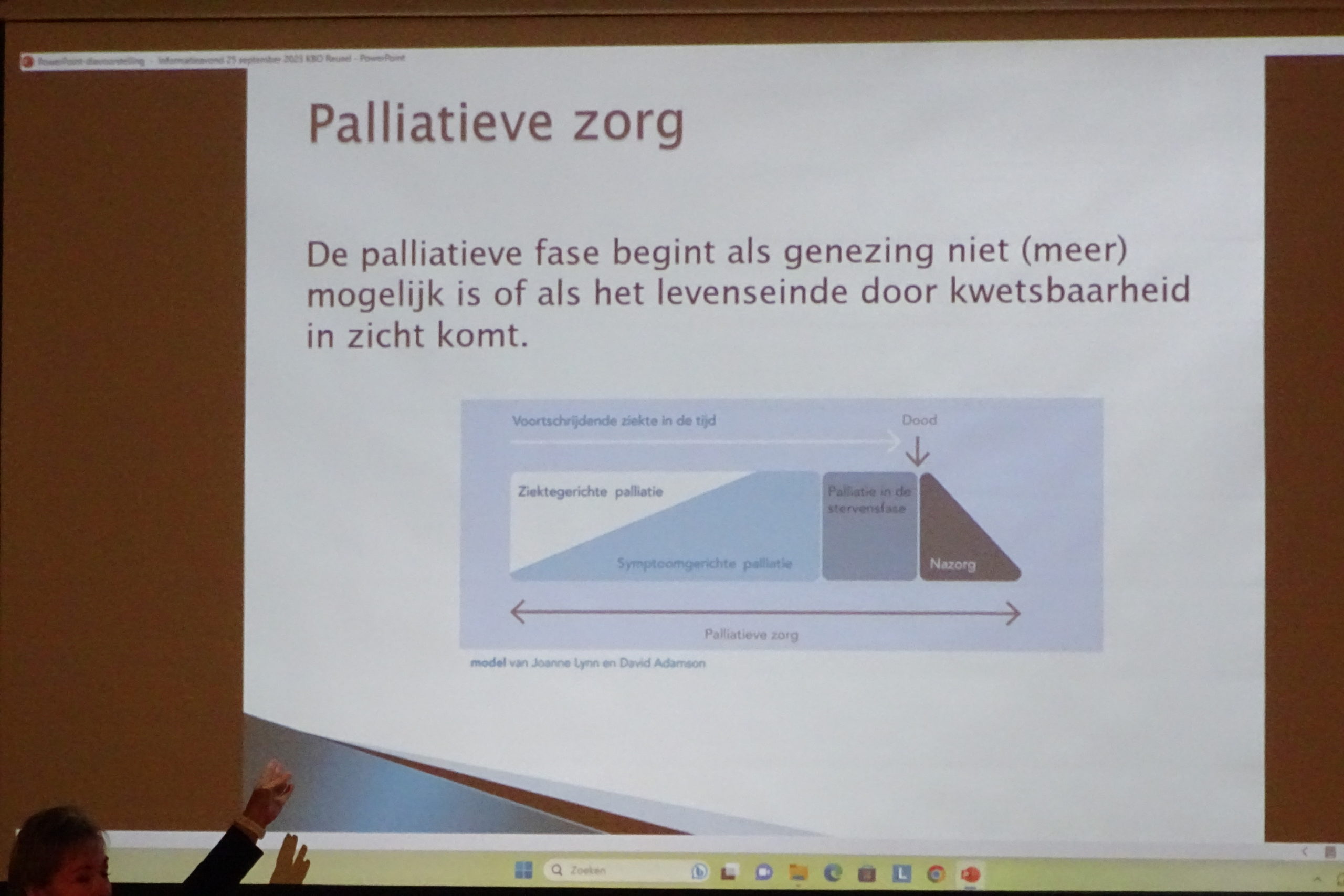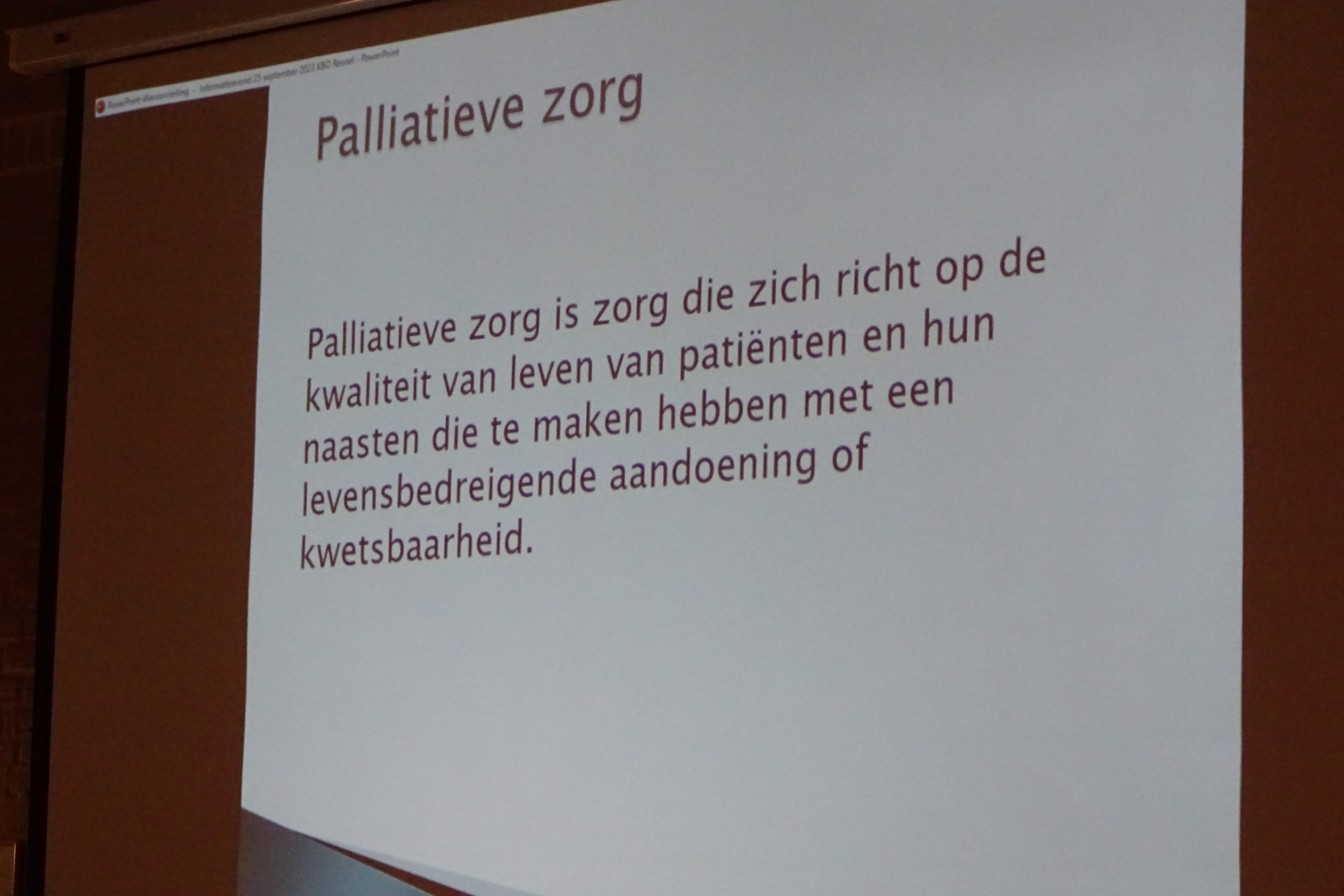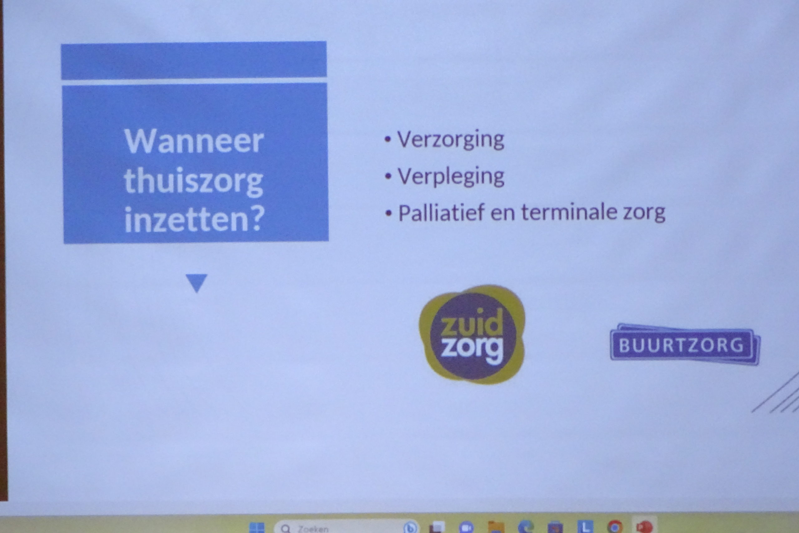 Tijdens deze avond vertelden huisarts dr. Hendriks en medewerkers van Zuidzorg en Buurtzorg m.b.v. een PowerPoint presentatie over wat hun taak is in de begeleiding en de mogelijkheden van palliatieve terminale thuiszorg.