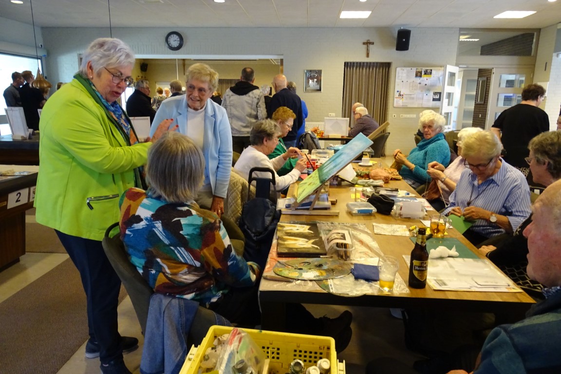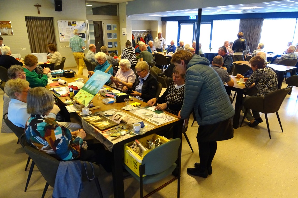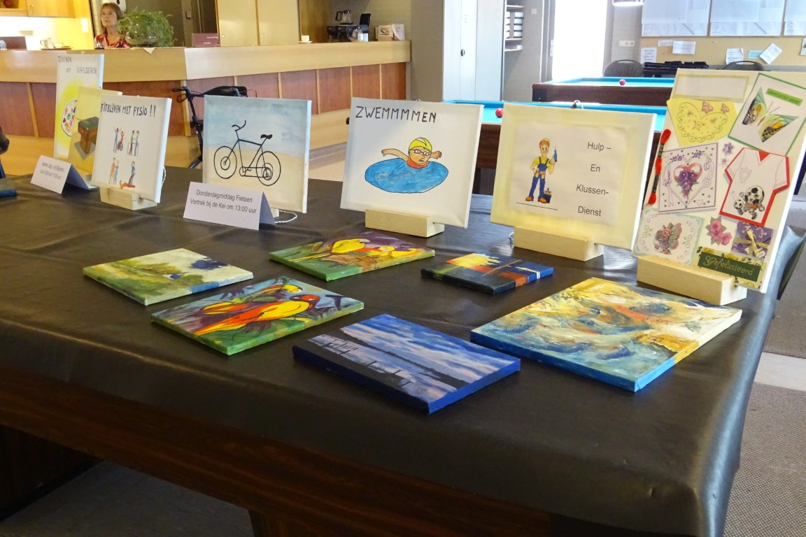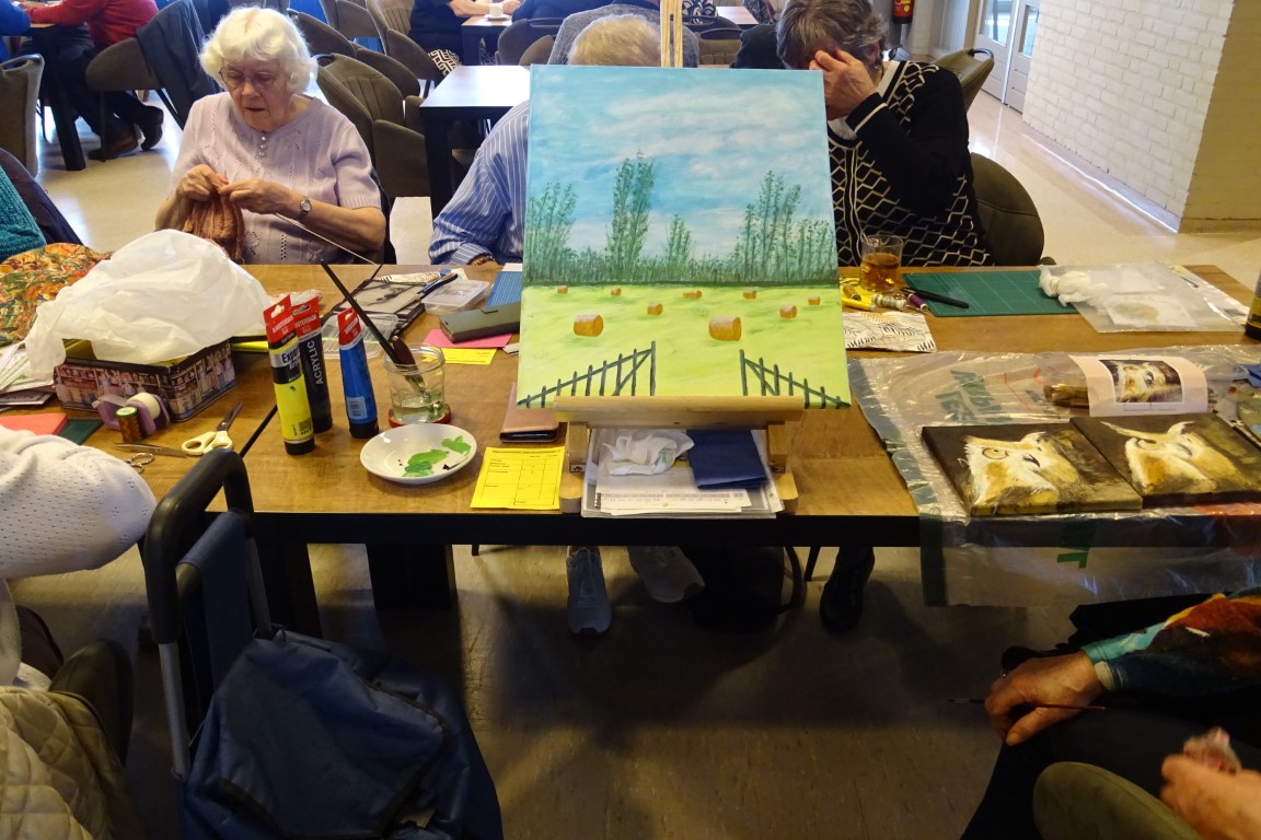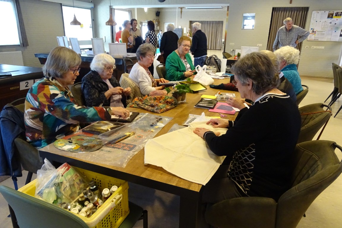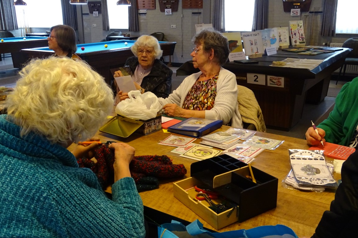 De dames van de creativiteits groep waren in de weer met hun creaties zoals kaarten maken, schilderen, haken en breien.