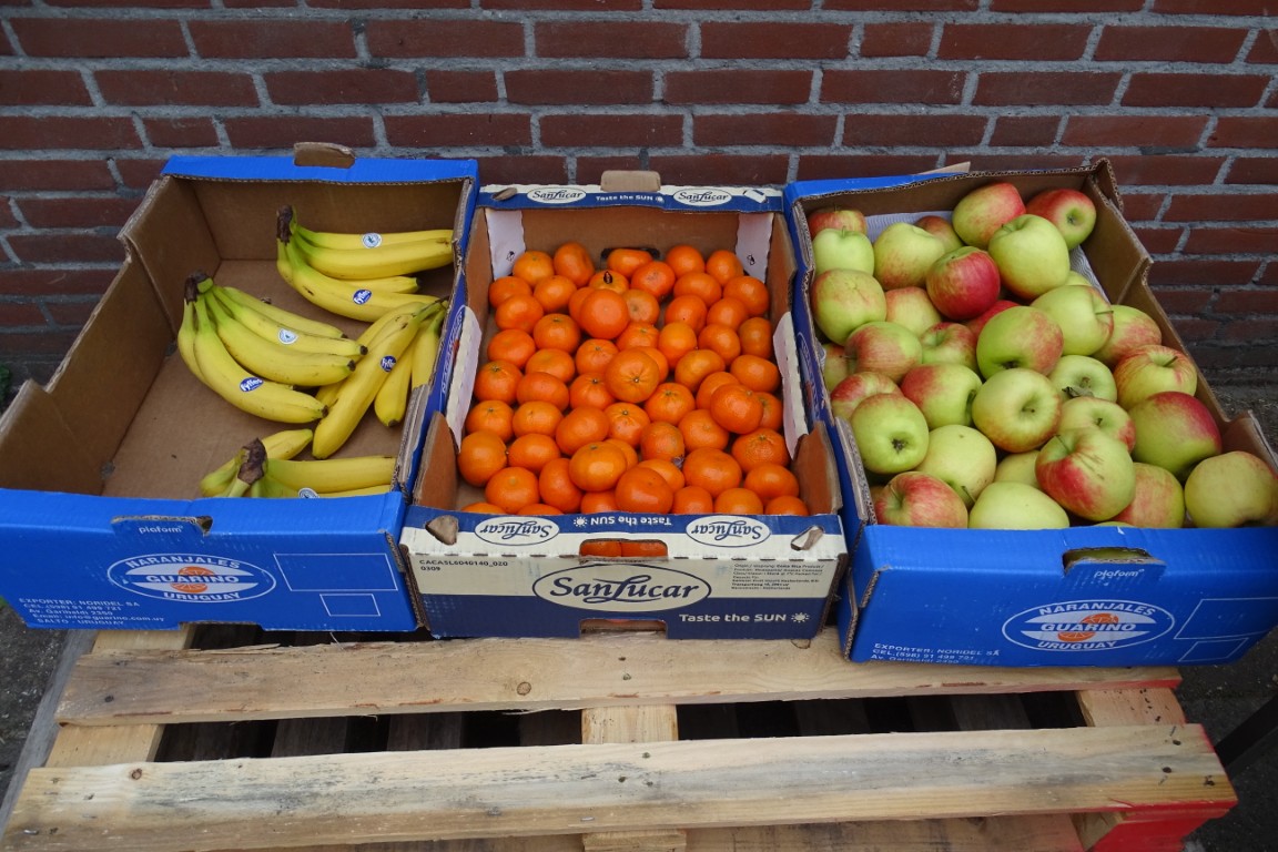 Ook lagen er appels en bananen die belangeloos geschonken waren door de Fruitspecialist, bekend van de vrijdagse Reuselse weekmarkt.